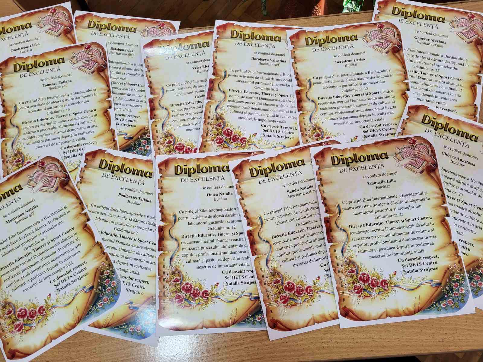 Dragi bucătari-șefi, bucătari și bucătari auxiliari, primiți la acest moment important diplomele de excelență ale Șefei DETS Centru, Natalia Străjesco ca însemn al activității de aleasă dăruire desfășurată în laboratorul gusturilor și aromelor din instituția de învățământ în care profesați.